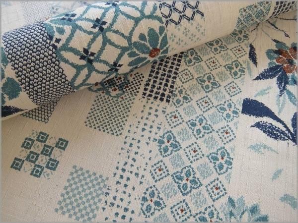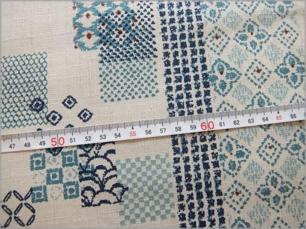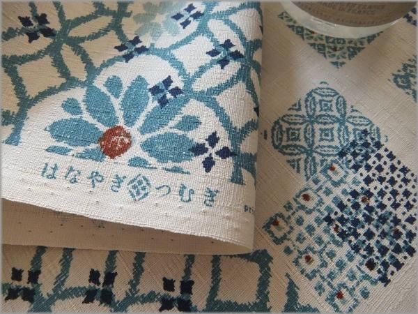 地色は明るいベージュ。プリントはブルー系。
