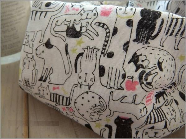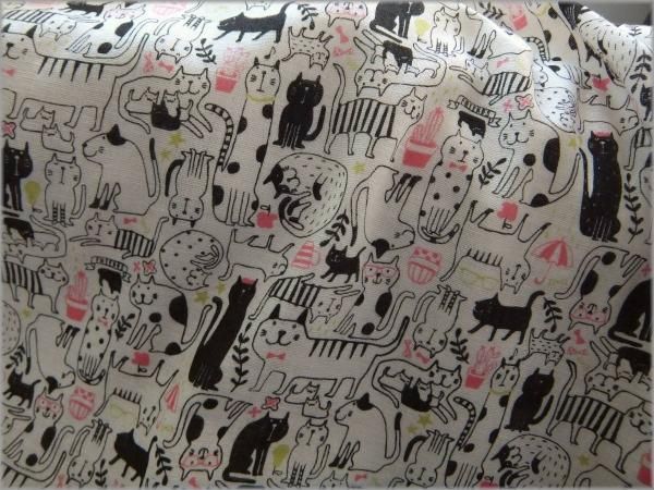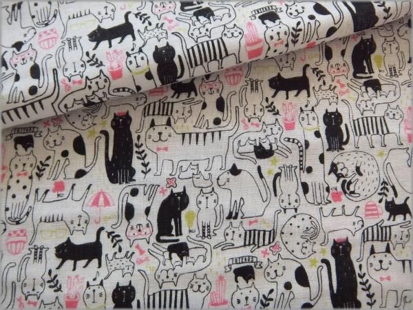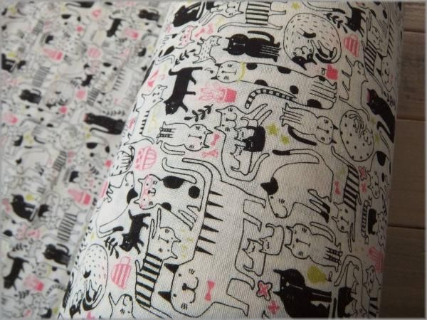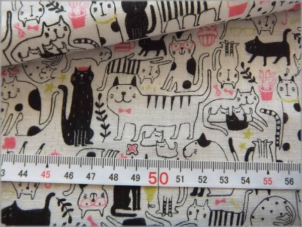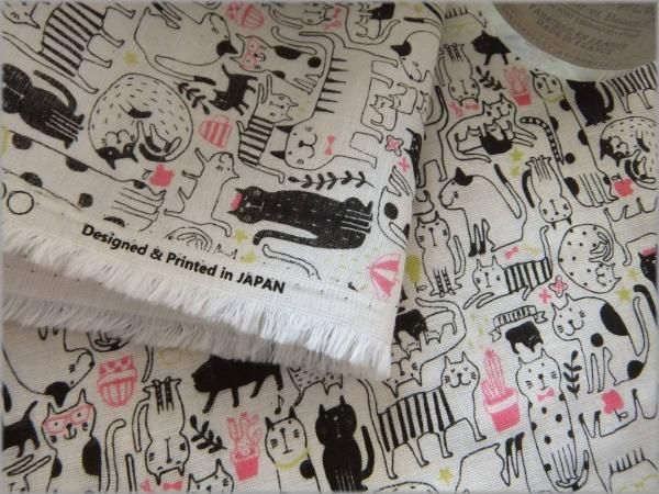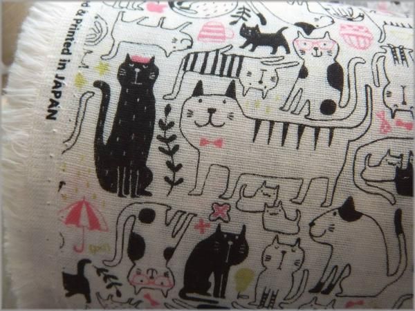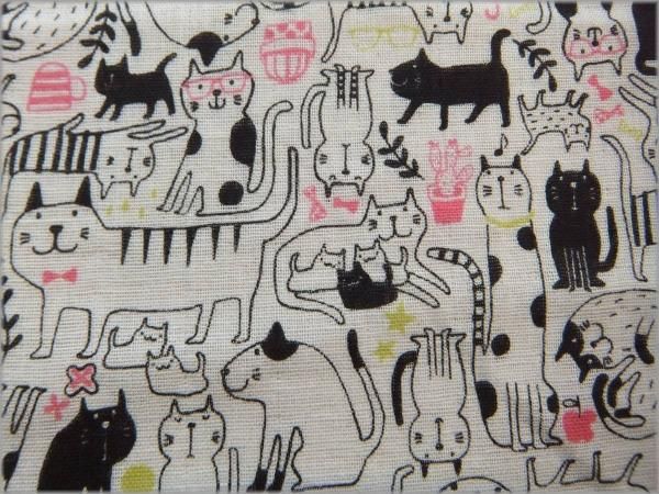 【ダブルガーゼ 生地】猫ネコ線描き*生成り×black*1B
